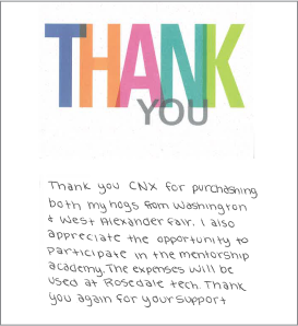 “The CNX Mentorship Academy provided me with opportunities that helped me decide my career path. I knew what I wasn’t interested in, but I was able to narrow my career choices by visiting a wide range of employers. CNX has truly supported me by purchasing both my market hogs at the 2023 Washington and West Alexander Fairs. This has helped immensely with school tuition, travel costs, and tools. I am thankful for the experience and opportunities that CNX has given me.”