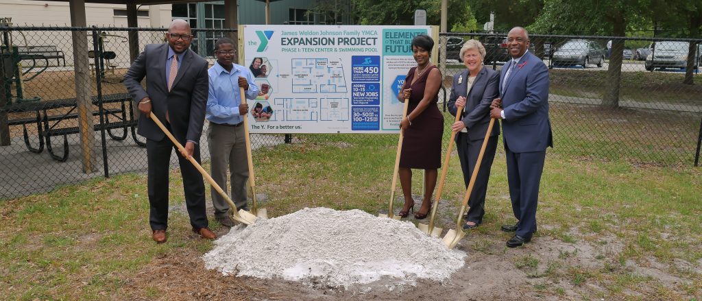 JACKSONVILLE, Fla. – May 14, 2018 – Today, the James Weldon Johnson Family YMCA celebrated the start of its highly-anticipated, $3.5 million expansion and renovation project with a special groundbreaking ceremony. More than 150 guests gathered near the project’s construction site to listen to remarks from Dr. Charles Moreland, Director of Community Affairs for Mayor Lenny Curry; Eric K. Mann, First Coast YMCA President and CEO and Dr. Irvin Cohen, Johnson Family YMCA Executive Director. When complete, the Johnson Family Y will have an all-new state-of-the-art Teen Center, Pre-Teen Center, new swimming pool and renovated wellness center.