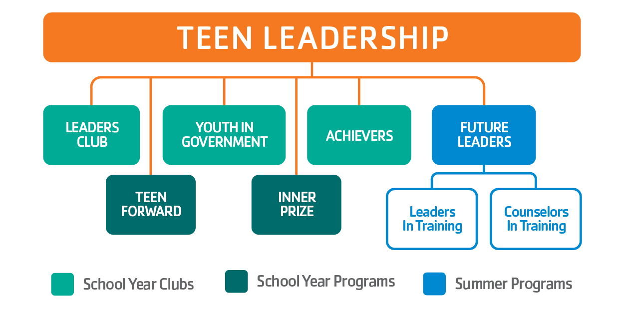 Our Teen Leadership is our teen program umbrella that encompasses our signature clubs such as Leaders Club, Youth in Government (YIG), Achievers and Future Leaders. The purpose of our programs is to support the positive cognitive, physical, and social-emotional growth of teens from cradle to career by providing programs that adhere to the character development model of empathy, relationship building, personal development, responsibility and emotion management.